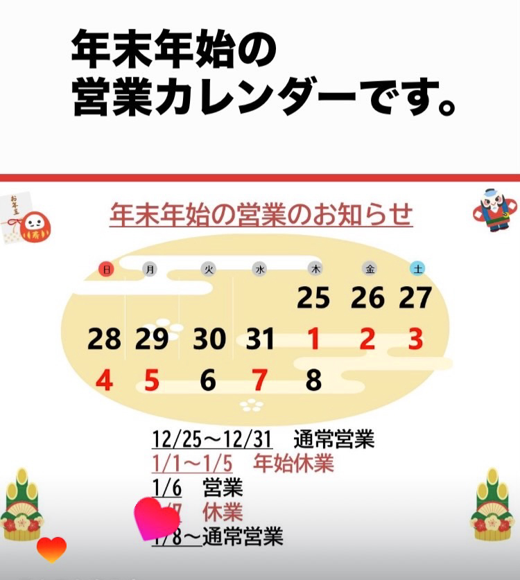 年末年始の営業につきまして、下記のとおりご案内いたします。■12月25日㊍〜12月31日㊌ 通常営業
